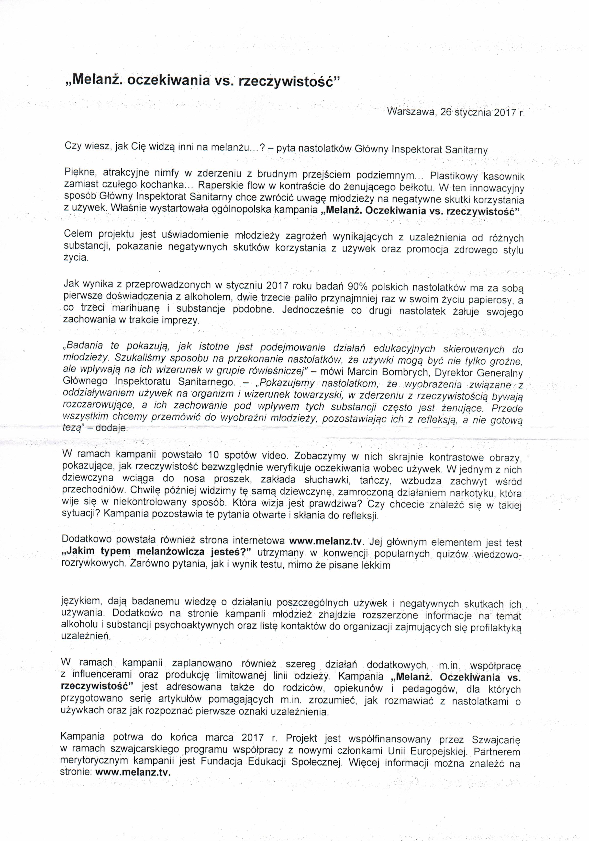 "Melanż. Oczekiwania vs. rzeczywistość" - ogólnopolska kampania realizowana przez Główny Inspektorat Sanitarny. Głównym celem kampanii jest zwrócenie uwagi młodzieży na…